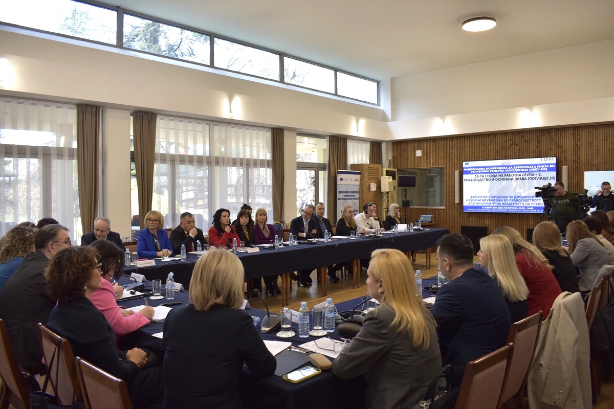 На 12 Февруари, во Клубот на пратеници во Скопје ја одржавме 18. сесија на Работната група 3 – Правосудство и основни права (Поглавје 23), во рамките на Националната конвенција за Европската Унија во Република Северна Македонија (НКЕУ-МК), во организација на Европското движење во Северна Македонија. Темата на сесијата беше „Европски стандарди за дисциплински и изборни механизми во правосудството како клучен елемент на владеењето на правото“, при што учесниците дискутираа за тековните реформски процеси, законските решенија и институционалниот капацитет за обезбедување баланс меѓу независноста и отчетноста на правосудните органи.