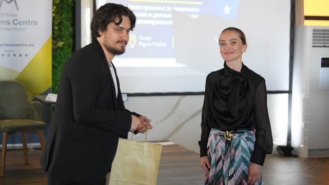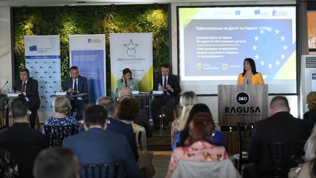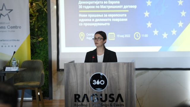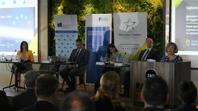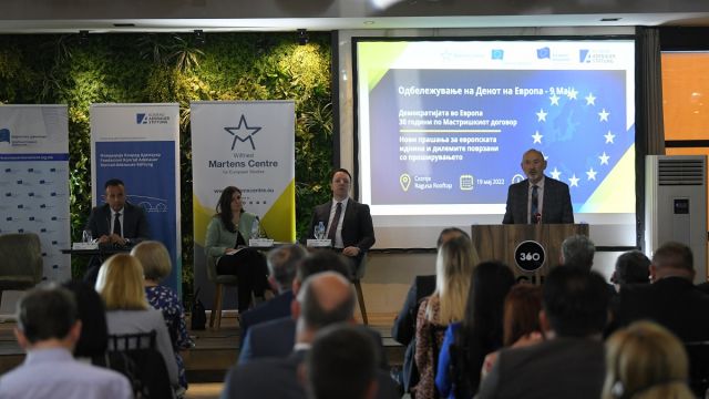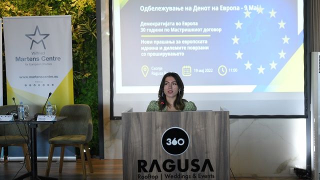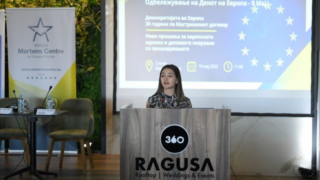 Катерина Јакимовска од Центарот за европски студии Вилфред Мартенс во своето поздравно обраќање истакна дека оваа година одбележувањето на Денот на Европа се одвива во горчлива атмосфера поради конфликтот во Украина и дека импликациите од истиот силно се чувствуваат во регионот на Западен Балкан, регион кој се наоѓа на крстосница и за кој сè почесто се поставува прашањето дали овој регион ќе успее да го задржи европскиот курс, бидејќи Европа е наша задача и мисија.
