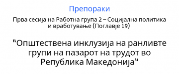 ПРЕПОРАКИ ОД ПРВА СЕСИЈА НА РАБОТНА ГРУПА 2 – СОЦИЈАЛНА ПОЛИТИКА И ВРАБОТУВАЊЕ (ПОГЛАВЈЕ 19) – “ОПШТЕСТВЕНА ИНКЛУЗИЈА НА РАНЛИВТЕ ГРУПИ НА ПАЗАРОТ НА ТРУДОТ ВО РЕПУБЛИКА МАКЕДОНИЈА“