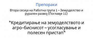ПРЕПОРАКИ ОД ВТОРА СЕСИЈА НА РАБОТНА ГРУПА 1 – ЗЕМЈОДЕЛСТВО И РУРАЛЕН РАЗВОЈ (ПОГЛАВЈЕ 11) – “КРЕДИТИРАЊЕ НА ЗЕМЈОДЕЛСТВОТО И АГРО-БИСНИСОТ – УСОГЛАСУВАЊЕ И ПОЛЕСЕН ПРИСТАП“