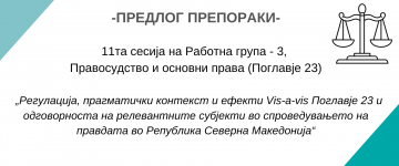 Предлог препораки од 11та сесија на Работна група 3 – Правосудство и основни права (Поглавје 23)- „Регулација, прагматички контекст и ефекти vis-a-vis Поглавје 23 и одговорноста на релевантните субјекти во спроведувањето на правдата во Република Северна Македонија“