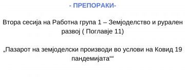 Препораки од осма сесија на Работна група 1 – Земјоделство и рурален развој (Поглавје 11) – „Пазарот на земјоделски производи во услови на Ковид 19 пандемијата““