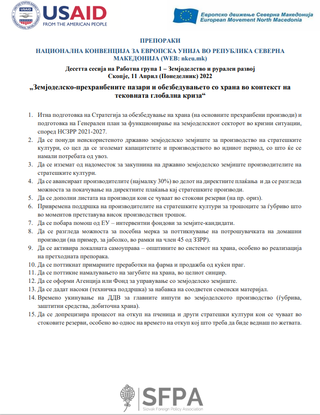 Десетта сесија на Работна група 1 – Земјоделство и рурален развој (Поглавје 11) – „Земјоделско-прехранбените пазари и обезбедувањето со храна во контекст на тековната глобална криза“