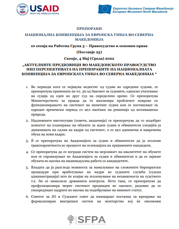 Десетта сесија на Работна група 3 – Правосудство и основни права (Поглавје 23)- „Актуелните предизвици во Македонското правосудство низ перспективата на препораките на националната конвенција за Европска унија во Северна Македонија“