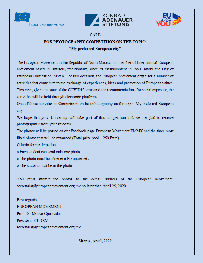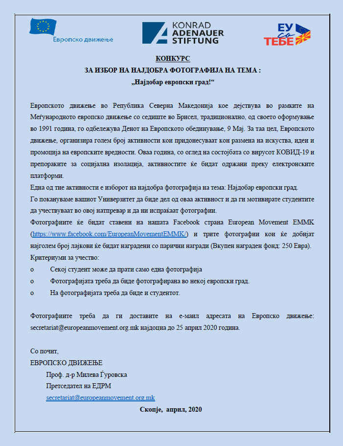 Фотографиите треба да ги доставите на е-маил адресата на Европско движење: secretariat@europeanmovement.org.mk најдоцна до 25 април 2020 година.