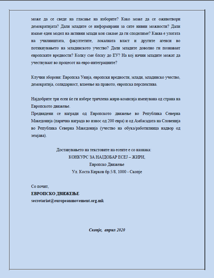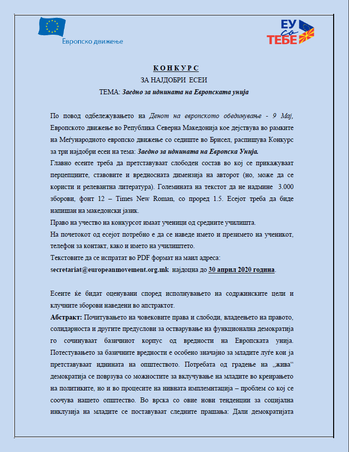 По повод одбележувањето на Денот на европското обединување, Европското движење во Република Северна Македонија кое дејствува во рамките на Меѓународното европско движење со седиште во Брисел, 9 Мај распишува Конкурс за три најдобри есеи на тема: Заедно за иднината на Европска Унија.