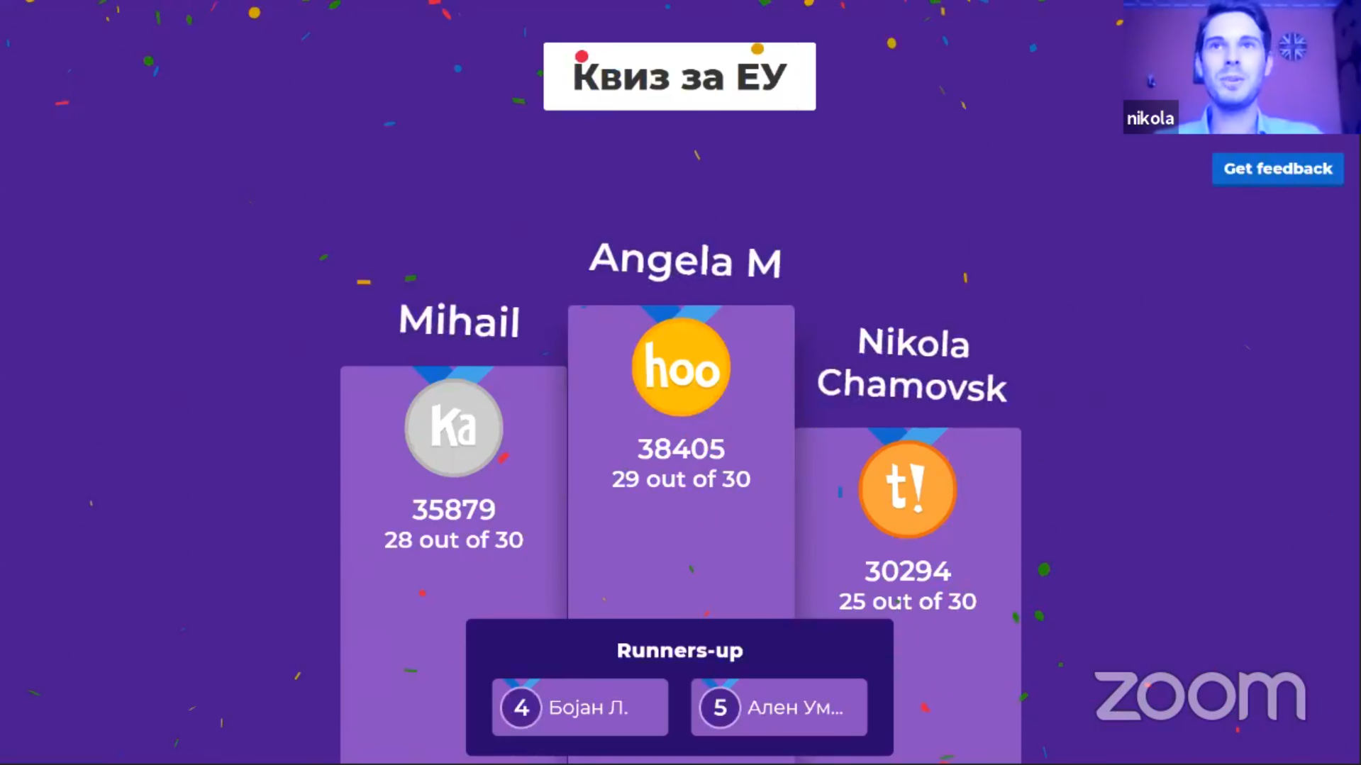 Покрај одговарање на поставените прашања, помеѓу блоковите на прашања учесниците во квизот имаа можност да се претстават себе си, да се запознаат меѓусебно, да разменат искуства поврзани со ЕУ, да ги споделат своите визии и размислувања за перспективите на нашата држава во ЕУ, да претстават што значи ЕУ за нив.