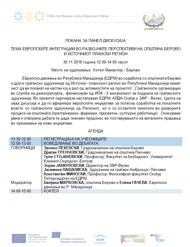 Европско движење во Република Македонија (ЕДРМ) во соработка со општината Берово и други граѓански здруженија од Источно- планскиот регион во Република Македонија имаат чест да ве поканат на настан кој е дел од активностите на проектот: „Граѓанските организации во служба на демократијата„  финансиран од ИПА – 2 механизмот за подршка на граѓанските здруженија. Во проектот партнерски настапуваат ЕДРМ, АЛДА-Скопје и ЗФР – Велес. Целта на оваа дисусија е да ги афирмира европските инцијативи за потесна соработка на локалните власти со граѓанските здруженија од Регионот, но и со остантите чинители во развојните процеси на општината (претприемачи, фармери, просветни, културни работници).  Очекуваме јавна и отворена дебата ќе даде значаен придонес во поставувањето на виталните прашања во преземање на нови инцијативи.