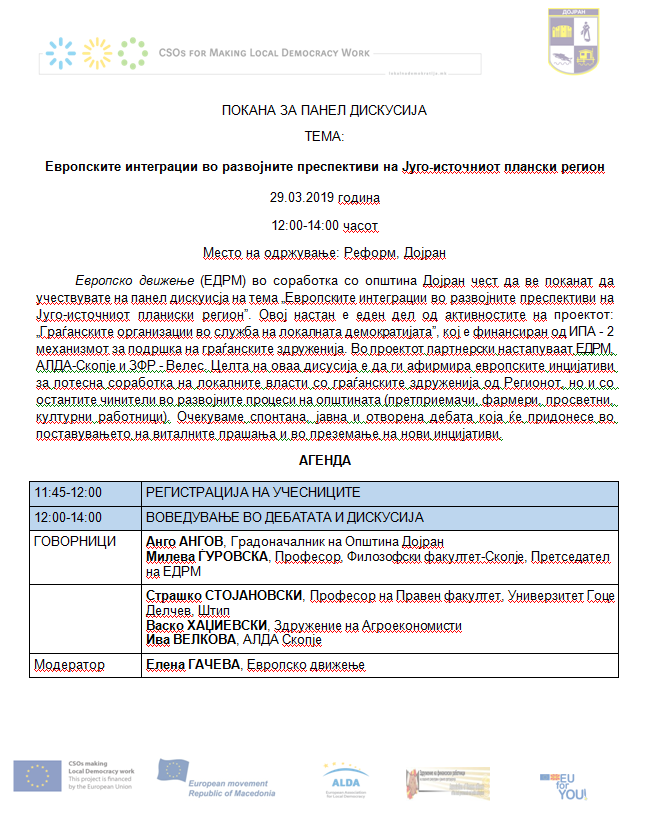 Европско движење (ЕДРМ) во соработка со општина Дојран чест да ве поканат да учествувате на панел дискуисја на тема „Европските интеграции во развојните преспективи на Југо-источниот планиски регион”. Овој настан е еден дел од активностите на проектот: „Граѓанските организации во служба на локалната демократијата”, кој е финансиран од ИПА – 2 механизмот за подршка на граѓанските здруженија. Во проектот партнерски настапуваат ЕДРМ, АЛДА-Скопје и ЗФР – Велес. Целта на оваа дисусија е да ги афирмира европските инцијативи за потесна соработка на локалните власти со граѓанските здруженија од Регионот, но и со остантите чинители во развојните процеси на општината (претприемачи, фармери, просветни, културни работници). Очекуваме спонтана, јавна и отворена дебата која ќе придонесе во поставувањето на виталните прашања и во преземање на нови инцијативи.