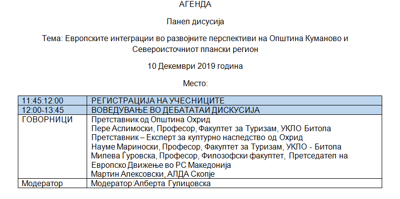Европското движење во Република Северна Македонија (ЕММК) организира панел дискусија чија цел е приближување на Претпристапните преговори за членство во Европската унија кон граѓаните. Имено, имајќи предвид дека РС Македонија е во финална фаза од подготовките за отпочнување на претпристапните преговори би сакале да ги споделиме резултатите од нашите досегашни истражувања со граѓаните на Општина Охрид и Југозападниот плански регион. Со оглед на сознанието за посебната улога на туризмот и културното наследство во овој Регион дискусијата ќе биде насочена во правец на идентификување на развојните фактори и на овој значаен сегмент од Поглавјето 26 на претпристапние преговори.