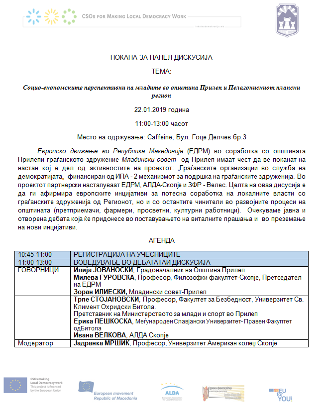 Европско движење во Република Македонија (ЕДРМ) во соработка со општината Прилепи граѓанското здружение Младински совет од Прилеп имаат чест да ве поканат на настан кој е дел од активностите на проектот: „Граѓанските организации во служба на демократијата„ финансиран од ИПА – 2 механизмот за подршка на граѓанските здруженија. Во проектот партнерски настапуваат ЕДРМ, АЛДА-Скопје и ЗФР – Велес. Целта на оваа дисусија е да ги афирмира европските инцијативи за потесна соработка на локалните власти со граѓанските здруженија од Регионот, но и со остантите чинители во развојните процеси на општината (претприемачи, фармери, просветни, културни работници). Очекуваме јавна и отворена дебата која ќе придонесе во поставувањето на виталните прашања и во преземање на нови инцијативи.