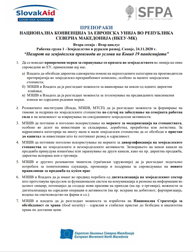 Препораки од осма сесија на Работна група 1 – Земјоделство и рурален развој (Поглавје 11) – „Пазарот на земјоделски производи во услови на Ковид 19 пандемијата““