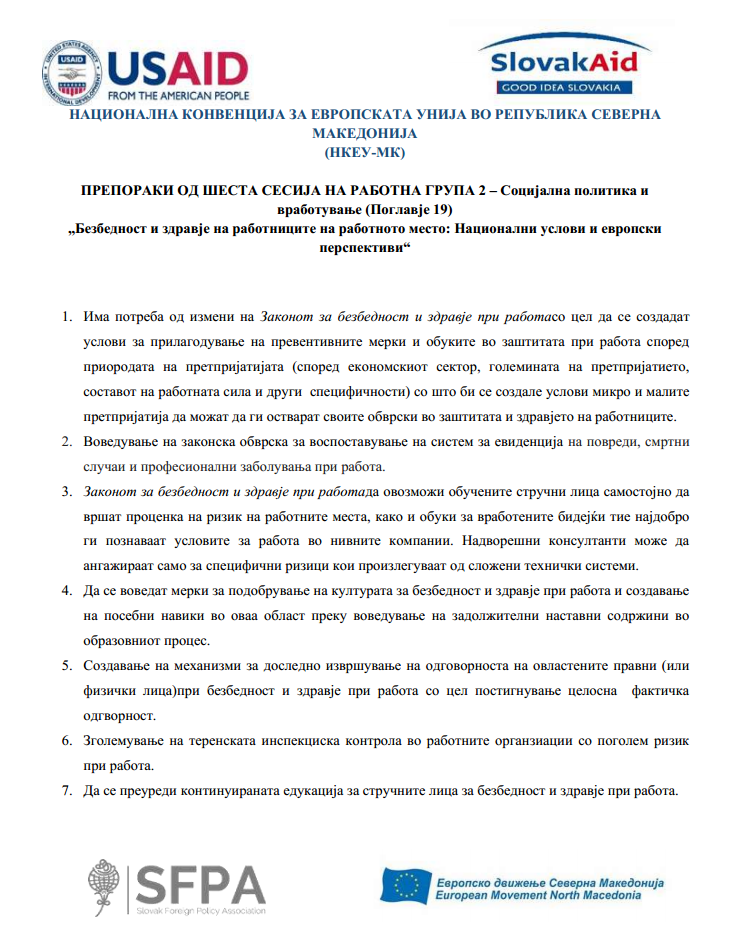 Препораки од Шеста сесија на Работна група 2 – Социјална политика и вработување (Поглавје 19) – „Безбедност и здравје на работниците на работното место: Национални услови и европски перспективи“