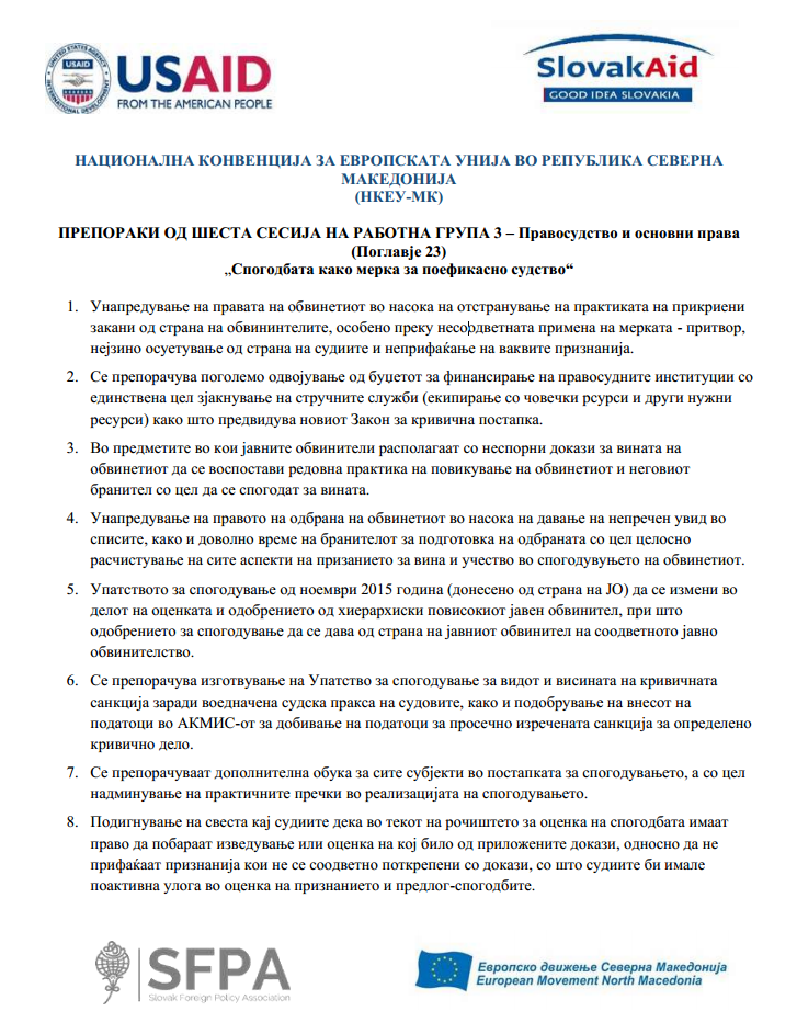 Препораки од Шеста сесија на Работна група 3 – Правосудство и основни права (Поглавје 23) – „Спогодбата како мерка за поефикасно судство“