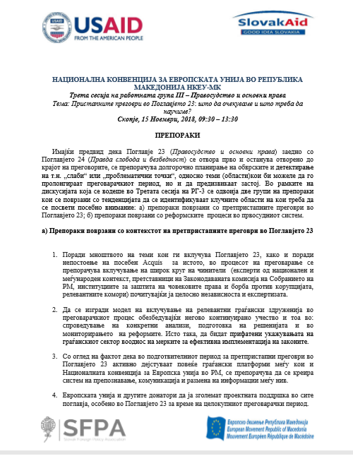 Препораки од Трета сесија на Работна група 3 – Правосудство и основни права (Поглавје 23) – “Пристапните преговори во Поглгвјето 23: Што да очекуваме и што треба да научиме?“