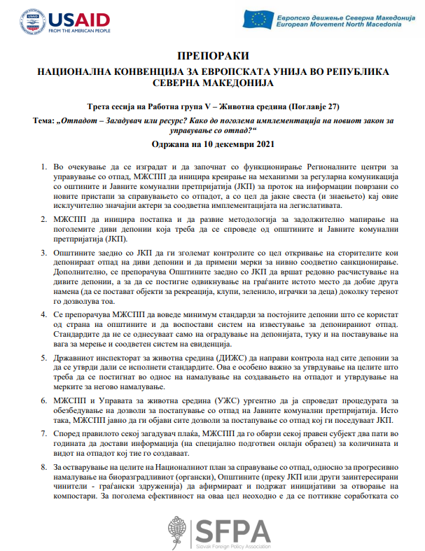 Препораки од третата сесија на Работна група 5 – Животна средина (Поглавје 27) „Отпадот – Загадувач или ресурс? Како до поголема имплементација на новиот закон за управување со отпад?“