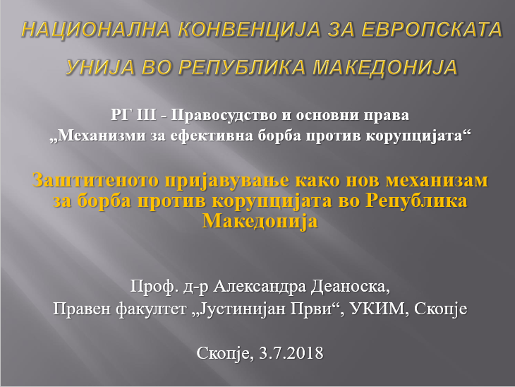 Презентација „Заштитено пријавување како нов механизам за борба против корупцијата во Република Македонија“ Проф. Александра Деаноска