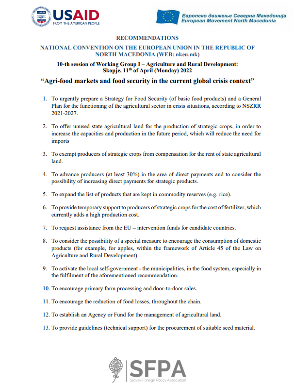 Recommendations from the 10th session of the Working Group 1: Agriculture and Rural development (Chapter 11) “Agri-food markets and food security in the current global crisis context”