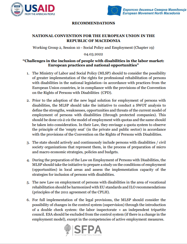 RECOMMENDATIONS FROM THE 10TH SESSION OF WORKING GROUP 2 – SOCIAL POLICY AND EMPLOYMENT (CHAPTER 19) – „Challenges in the inclusion of people with disabilities in the labor market: European practices and national opportunities“