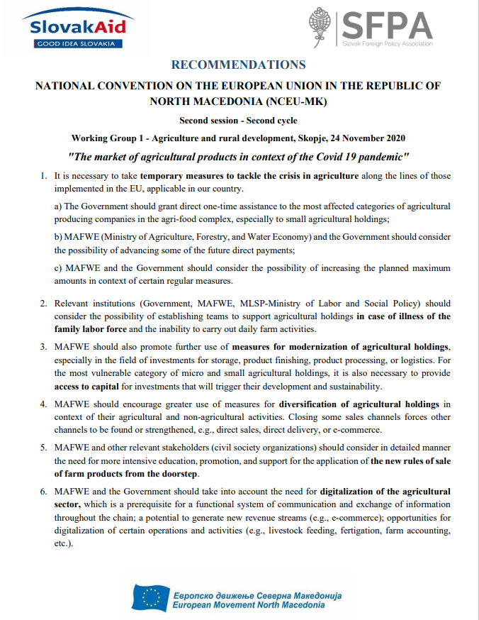 Recommendations from the eight session of Working Group 1 – Agriculture and Rural Development (Chapter 11) – “The market of agricultural products in context of the Covid 19 pandemic””