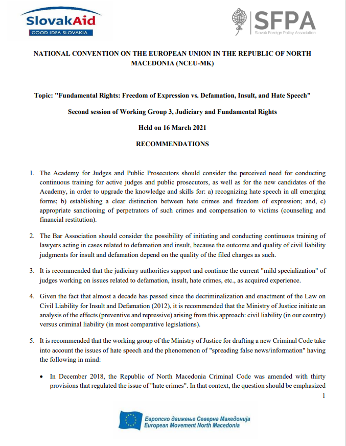 Recommendations from the Eight session of Working group 3 – Judiciary and Fundamental rights (Chapter 23) – “Fundamental Rights: Freedom of Expression vs. Defamation, Insult, and Hate Speech”