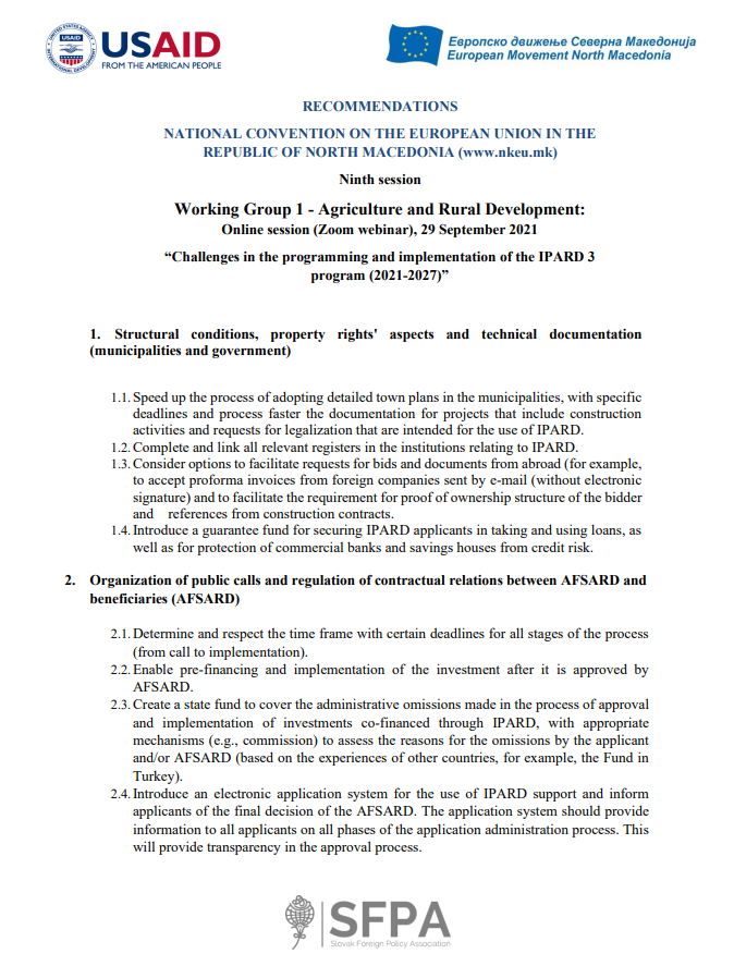 Recommendations from the Ninth session of Working Group 1 – Agriculture and Rural Development (Chapter 11) – “Challenges in the programming and implementation of the IPARD III program (2021-2027)”