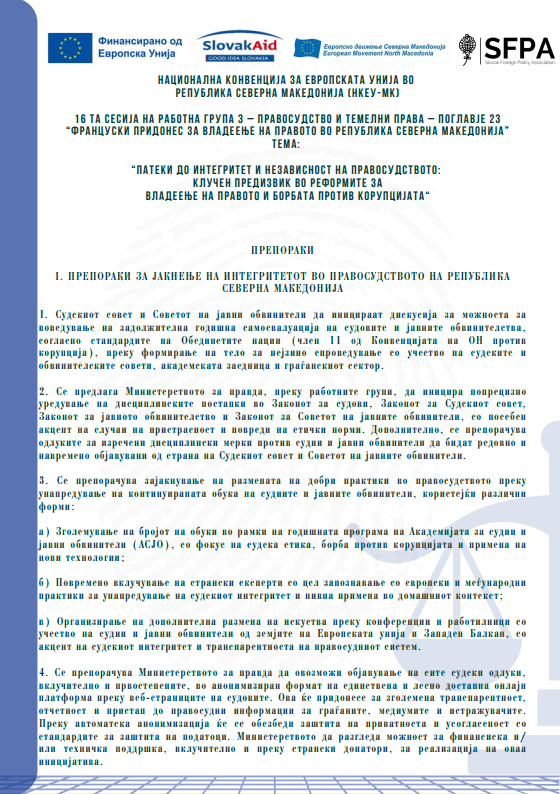 Препораки 16та сесија на Работна група 3 – Правосудство и темелни права (Поглавје 23): “Патеки до интегритет и независност на правосудството: Клучен предизвик во реформите за владеење на правото и борбата против корупцијата