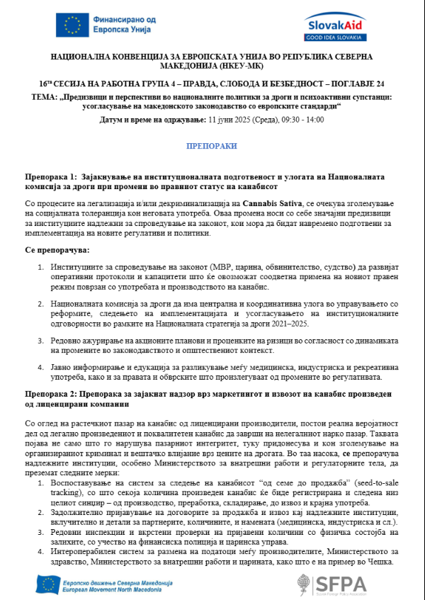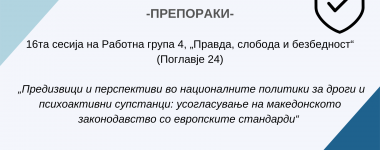 Препораки 16та сесија на Работна група 4: „Правда, слобода и безбедност“ (Поглавје 24): „Предизвици и перспективи во националните политики за дроги и психоактивни супстанци: усогласување на македонското законодавство со европските стандарди“