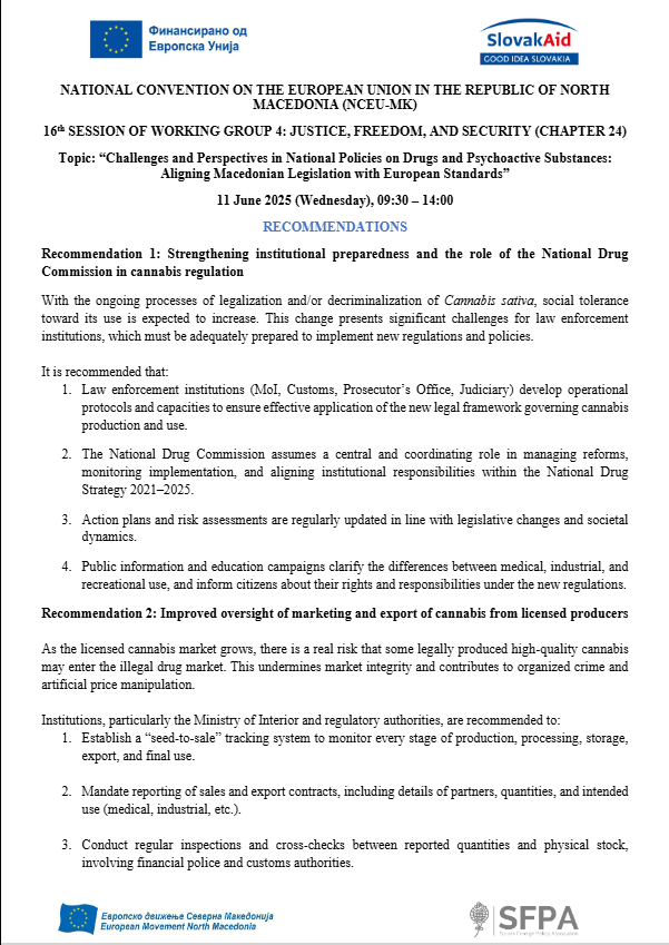 RECOMMENDATIONS OF 16th SESSION OF WORKING GROUP 4: JUSTICE, FREEDOM, AND SECURITY (CHAPTER 24): “Challenges and Perspectives in National Policies on Drugs and Psychoactive Substances: Aligning Macedonian Legislation with European Standards”